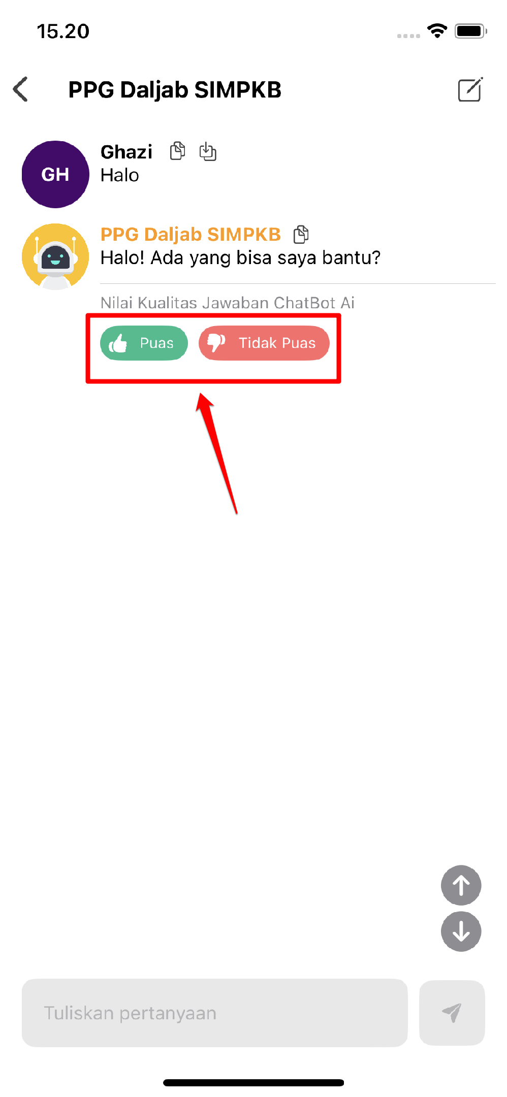 Sistem akan menampilkan kotak dialog percakapan (chatting) seperti pada gambar dibawah ini. Klik "Buat sesi pertanyaan baru" untuk memulai percakapan dengan chatbot.